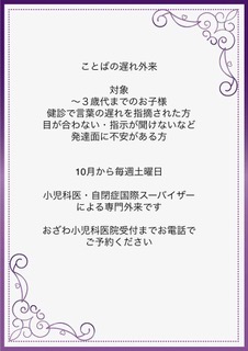 3歳代までの言葉の遅れのあるお子さんを対象に、毎週土曜日、新たに外来枠を設けます。